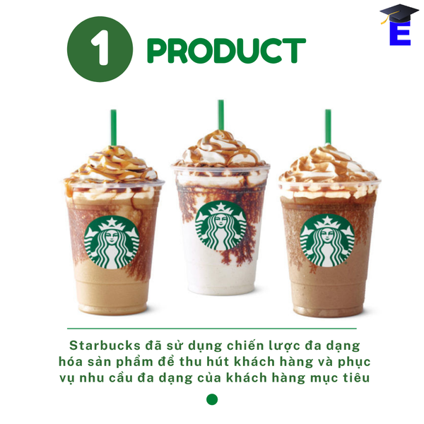 Khi phân tích chiến lược Marketing của Starbucks về sản phẩm (Product), Starbucks đã sử dụng chiến lược đa dạng hóa sản phẩm để thu hút khách hàng và phục vụ được những nhu cầu đa dạng của khách hàng mục tiêu.