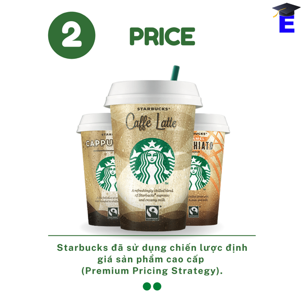 Đối với chiến lược Marketing của Starbucks về giá (Price), thương hiệu này đã sử dụng chiến lược định giá sản phẩm cao cấp (Premium Pricing Strategy).